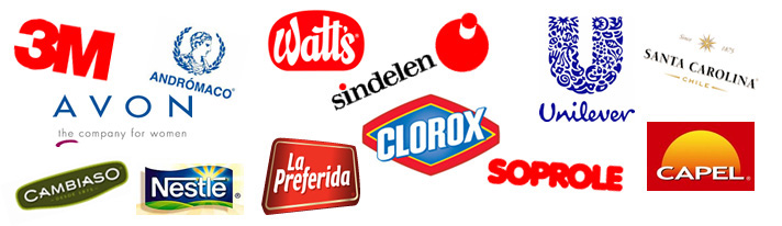 • NESTLE • AVON • CMPC • UNILEVER • WATT´S ALIMENTOS • CLOROX CHILE • VIÑA SANTA CAROLINA • VITAL S.A. • LA PREFERIDA • VIÑA TARAPACA EX ZAVALA • EMBOTELLADORA COCA-COLA POLAR • EMBOTELLADORA IQUIQUE • LABORATORIO DAVIS • LABORATORIO CHILE • LABORATORIO MAVER • ANDROMACO • VIÑA MISIONES DE RENGO • DOS EN UNO • HENKEL CHILE • CAROZZI • VIRGINIA • CRISTALERIAS TORO • CRISTALERIAS CHILE • VIÑA CONCHA Y TORO • SQM • CCU • 3M • SINDELEN • PISCO CAPEL • EMBOTELLADORA ANDINA • SOPROLE • EDEN • CAMBIASO